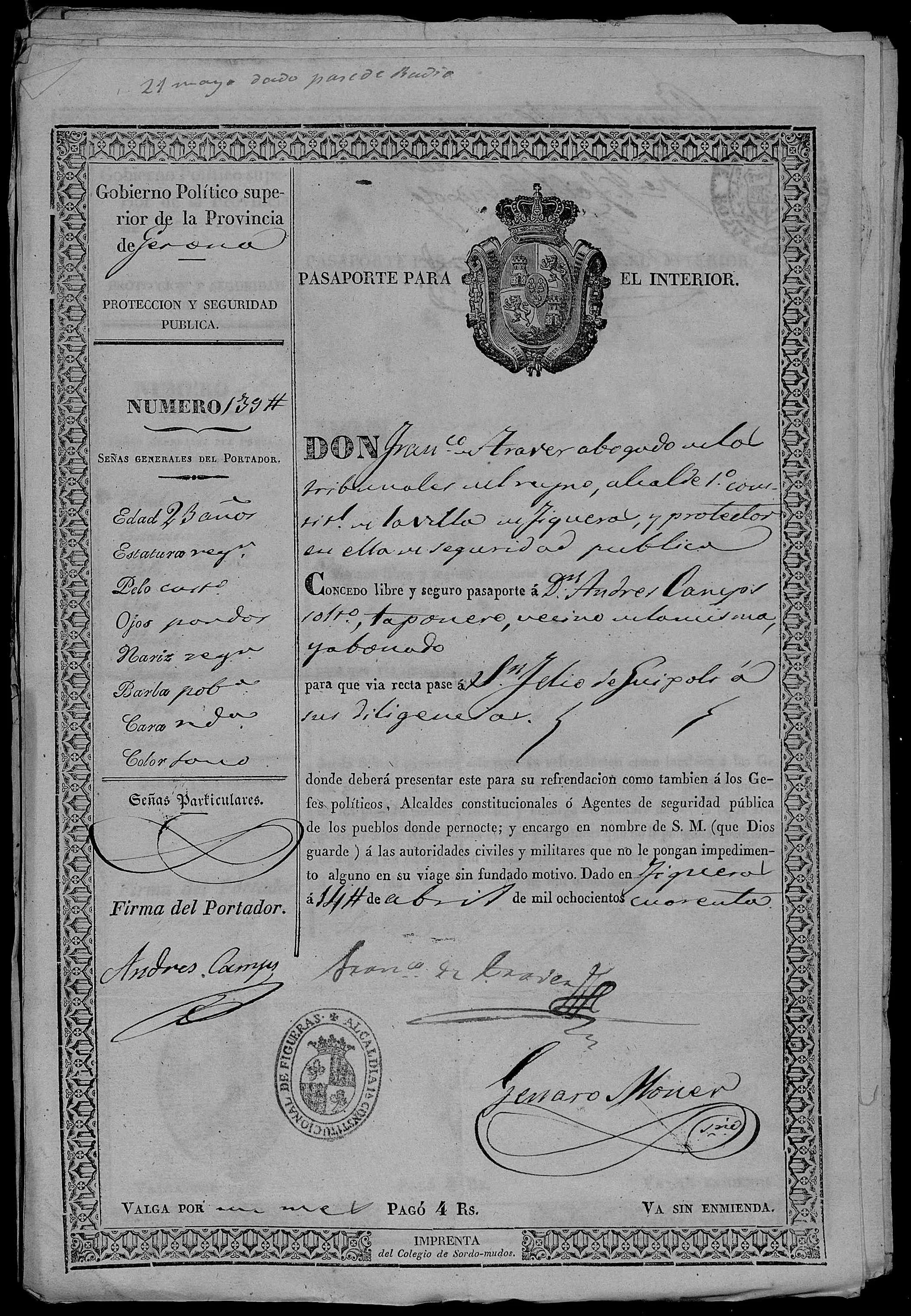 Bilhete de residência para José Manuel Guerardo Sureda, rolheiro, 44 anos, natural de Cassà de la Selva, Gerona, autorização de 1 ano. Residente Azaruja. 23 de março de 1888. Coleção Sabina Tique.