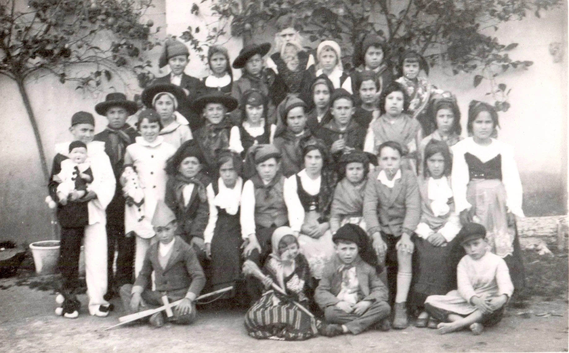 Neste dia as meninas colocavam na lapela dos senhores uma flor branca num peditório que alimentava a kermesse. Dos três senhores mais velhos sentado à direita: Pepe Duque mais abaixo no canto: Pepe Ferrão. Coleção Duque.