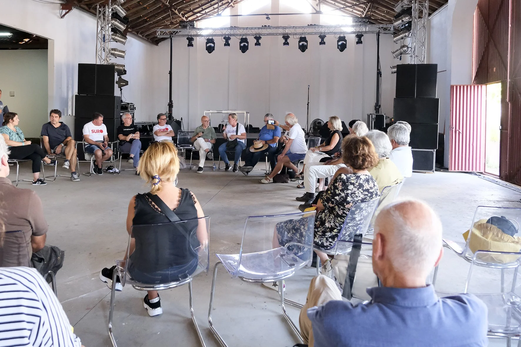 O jornalista Ramon Font, fundador da Delegação da Catalunha em Portugal, modera o debate entre a comunidade de Azaruja e a comitiva de Cassà de la Selva, integrada por Àngel e Eloi Madrià, Quim Cadanet, Joan Carles Codolà e Xavier Albertí.