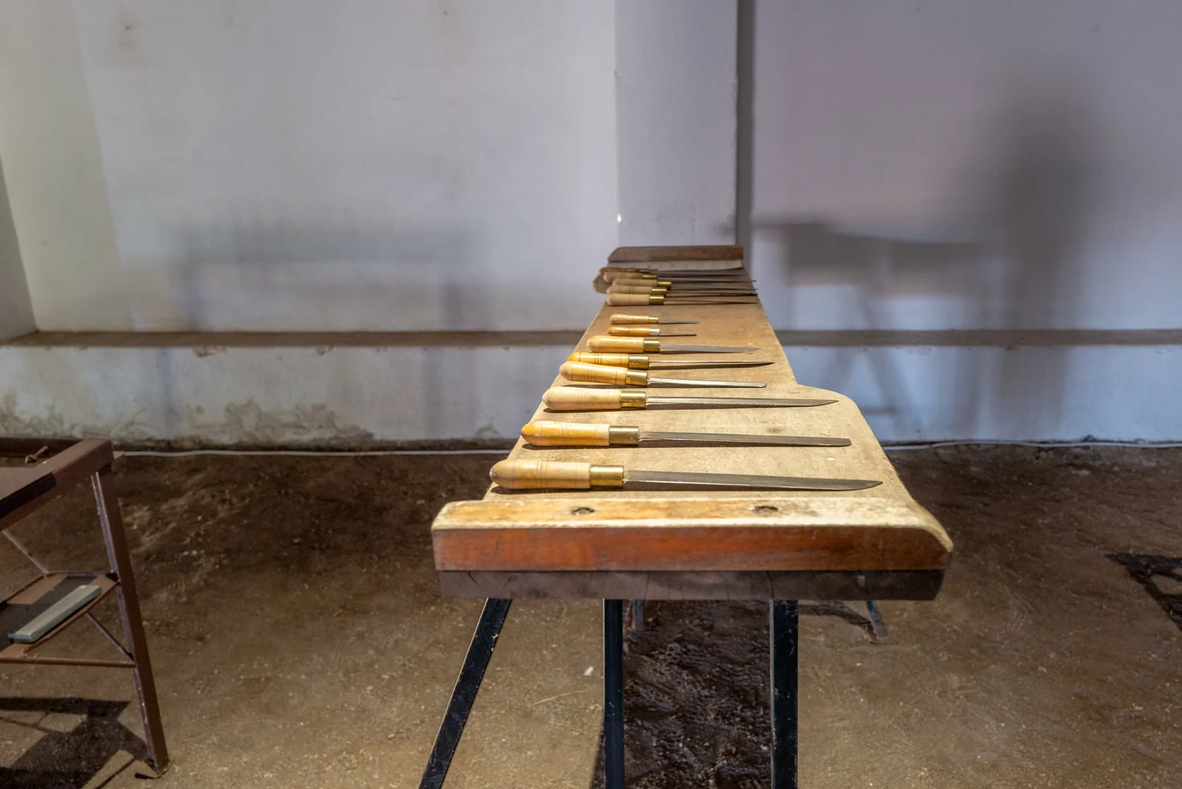 Posto de trabalho duplo, concebido com recorte específico para dois apoios e dois orifícios destinados ao acondicionamento de objetos pessoais do traçador ou do escolhedor — designadamente: facas corticeiras (curva e reta), pé-de-linhas e pedra de amolar.