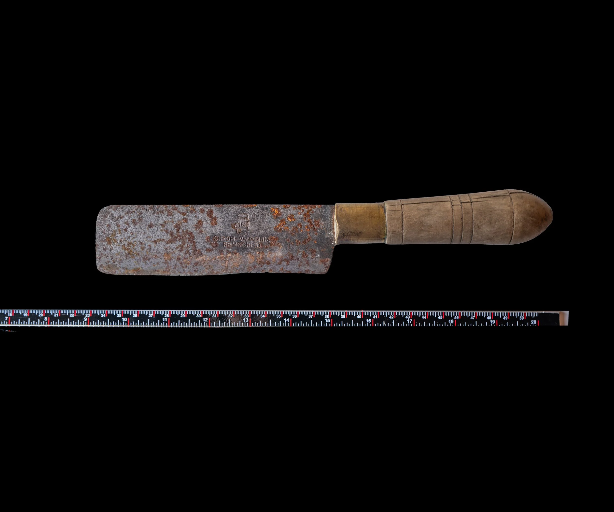 15. FACA CORTICEIRA DIREITA Ferramenta utilizada no trabalho da cortiça. Faca de lâmina alta, de origem alemã, com cabo em madeira de oliveira decorado segundo o padrão “Franzina”. Na lâmina pode ler-se a inscrição: “Chrome Vanadium Remscheid”. Este exemplar ilustra o aproveitamento, por parte da casa Franzina, de lâminas antigas, posteriormente restauradas. Inv. CFC0015.25DFC.FCD.A