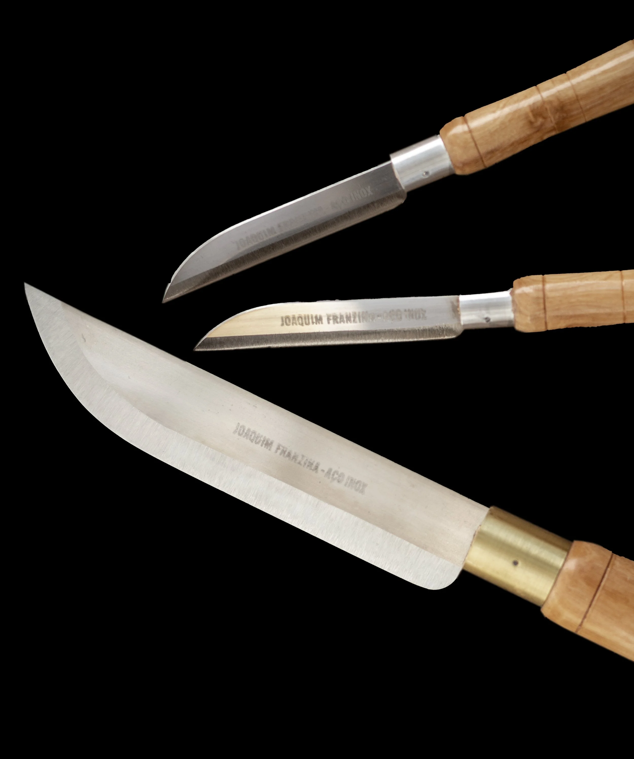4. 7. 8. 9. 10. 15. FACA DE COZINHA Conjunto de facas domésticas da marca “Franzina”, com cabo em madeira de oliveira decorado (duas incisões decorativas na extremidade, três ao centro e uma junto à anilha metálica), e lâmina em aço. A fábrica de facas Franzina desenvolveu esta linha a partir do reaproveitamento de restos de facas corticeiras, criando uma coleção direcionada para uso doméstico. A durabilidade destas peças é notável — um dos exemplares aqui expostos tem mais de 45 anos. Inv. CFC0007.25DFC.FC.A Inv. CFC0008.25DFC.FC.A Inv. CFC0009.25DFC.FC.A Inv. CFC0010.25DFC.FC.A Inv. CFC0011.25DFC.FC.A