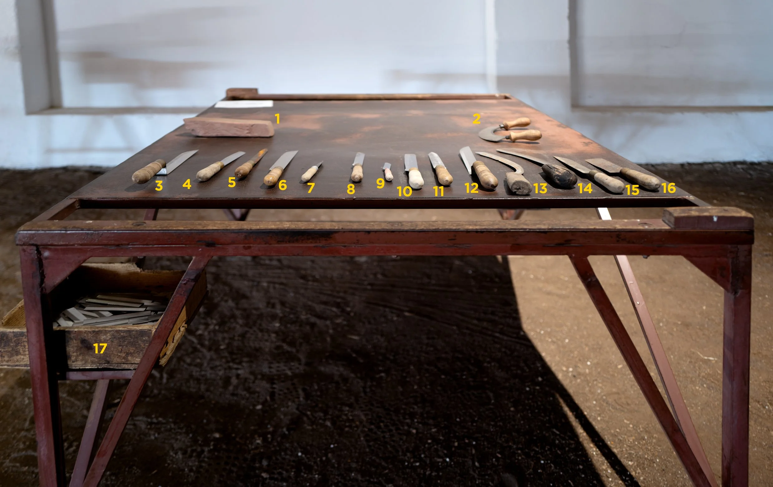 Esta mesa, concebida para dois postos de trabalho, era utilizada nas fábricas de preparação de cortiça de Azaruja (Alentejo). Fabricada em metal vermelho-escuro perfurado — embora também existam versões em madeira —, integra suportes para facas, pé de linhas e pedra de amolar, refletindo a funcionalidade exigida pelo processo de triagem e corte da cortiça.
