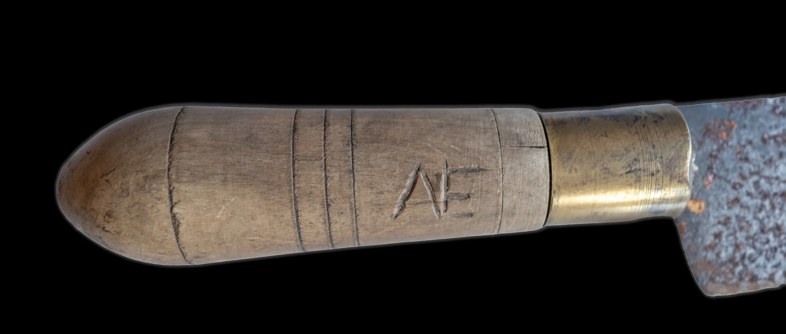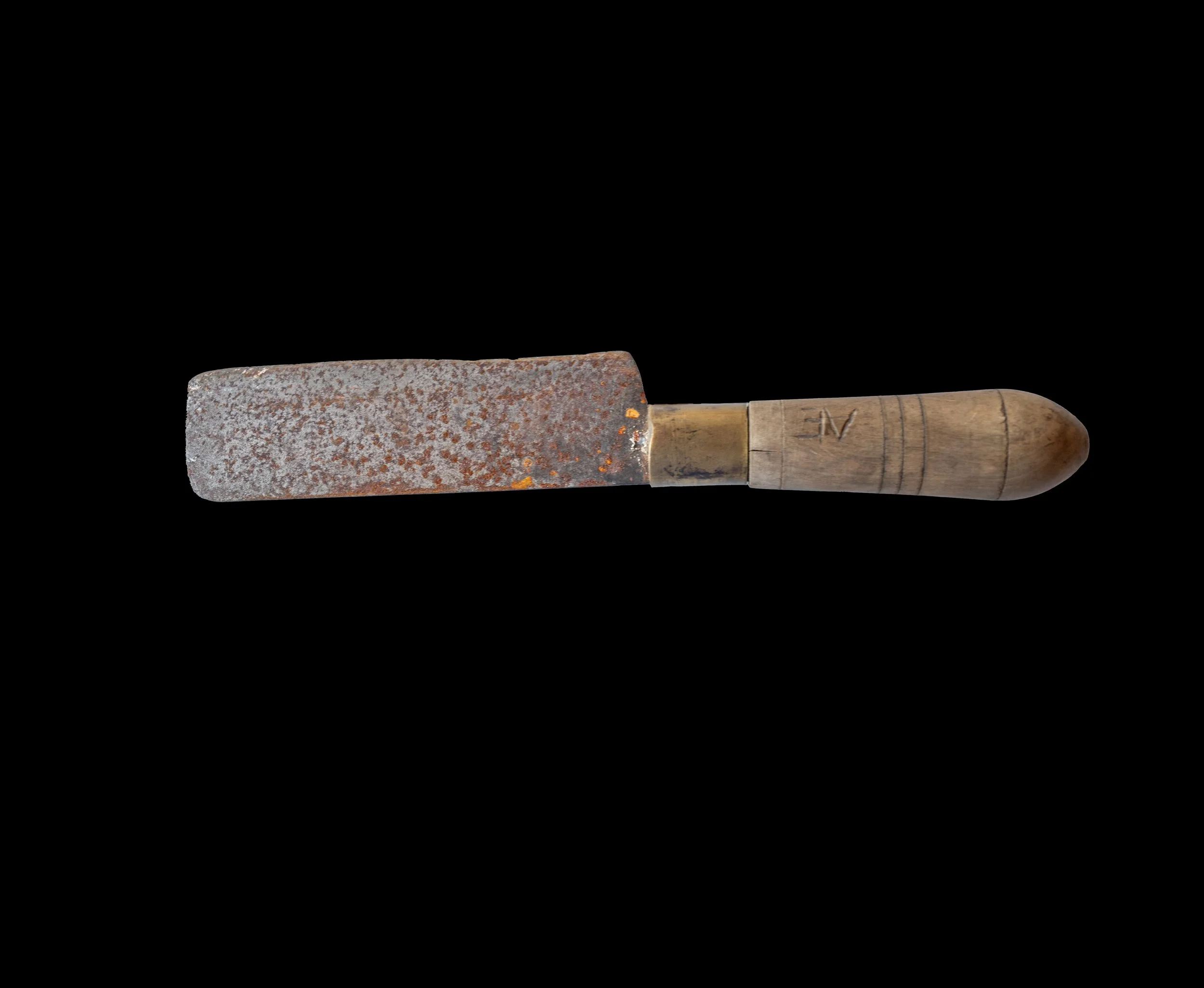 2. MEIA-LUA Ferramenta utilizada na matança do porco. Possui fio encurvado e duas pegas em madeira de oliveira, com dois anéis metálicos entre a lâmina e o cabo. Apresenta marca ilegível. A meia-lua era usada para cortar a carne em pequenos cubos destinados à preparação de enchidos, como o toucinho do cachaço e do lombo, para a confeção de linguiças e botifarras — enchidos de origem catalã. Inv. CFC0002.25DFC.ML.A