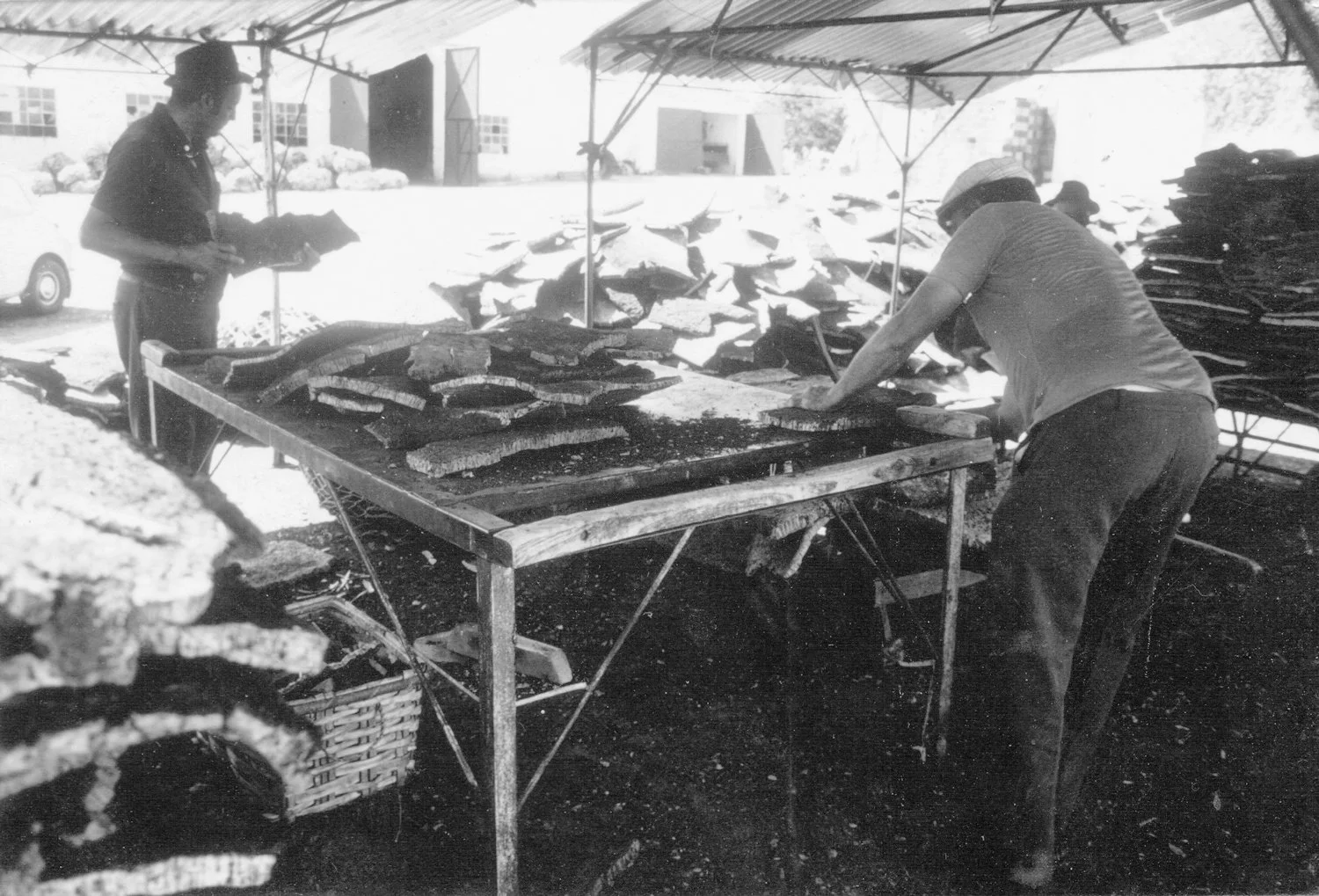 Operários a traçar e escolher cortiças na Empresa “António Pepe & Maria Lucinda Lda.” (no espaço exterior da sede da Fábrica Catalã), Azaruja 1973