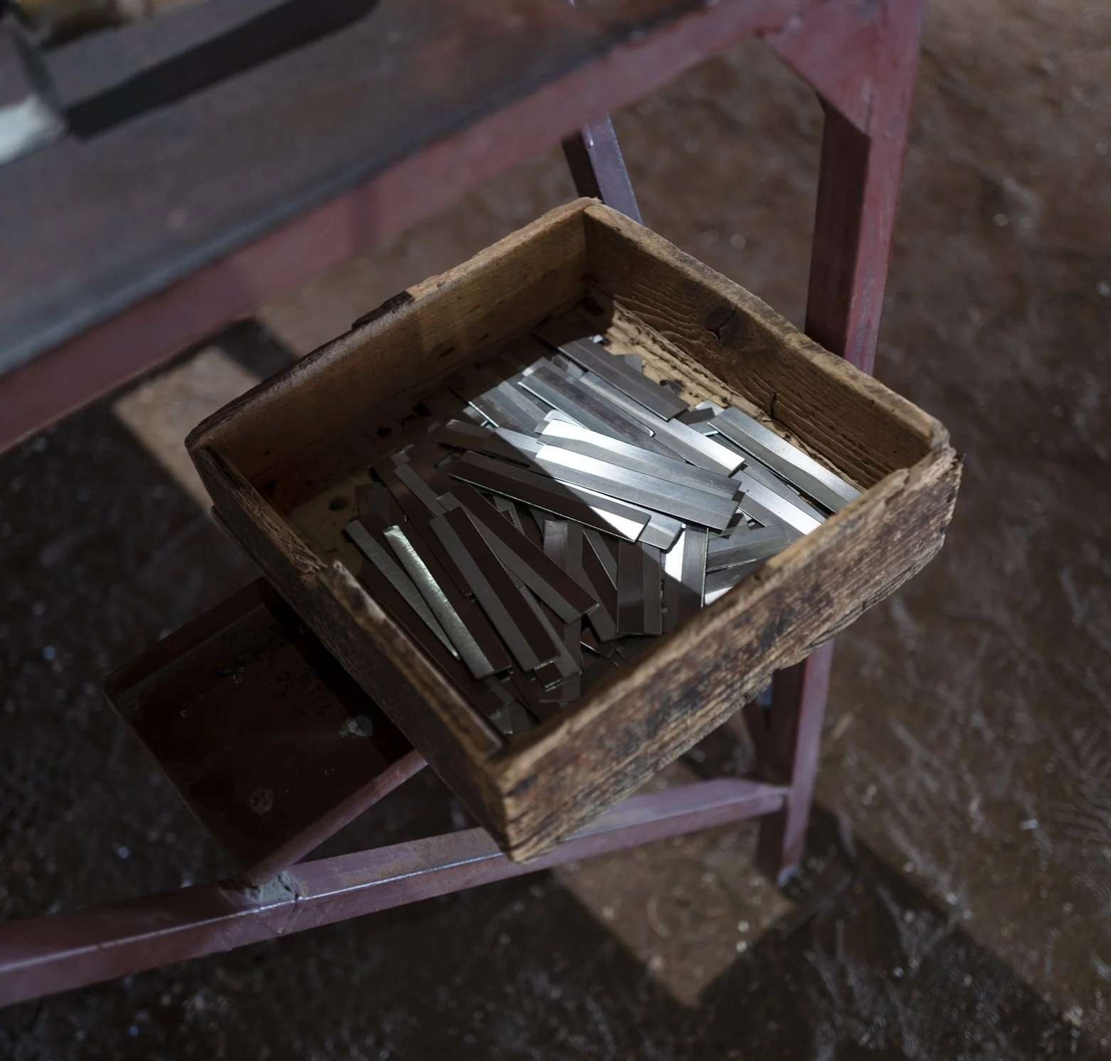16. e 17. CAIXA DE MADEIRA COM CONJUNTO DE LÂMINAS Caixa de madeira utilizada para armazenar lâminas destinadas à montagem das facas da marca Franzina. O aço utilizado nestas lâminas era importado da Suíça, da Áustria ou da Alemanha, consoante a flutuação cambial no momento da aquisição. Esta prática permitia ajustar a produção às variações económicas, mantendo a qualidade do material. Inv. CFC0016.25DFC.CM.B Inv. CFC0017.25DFC.L.B