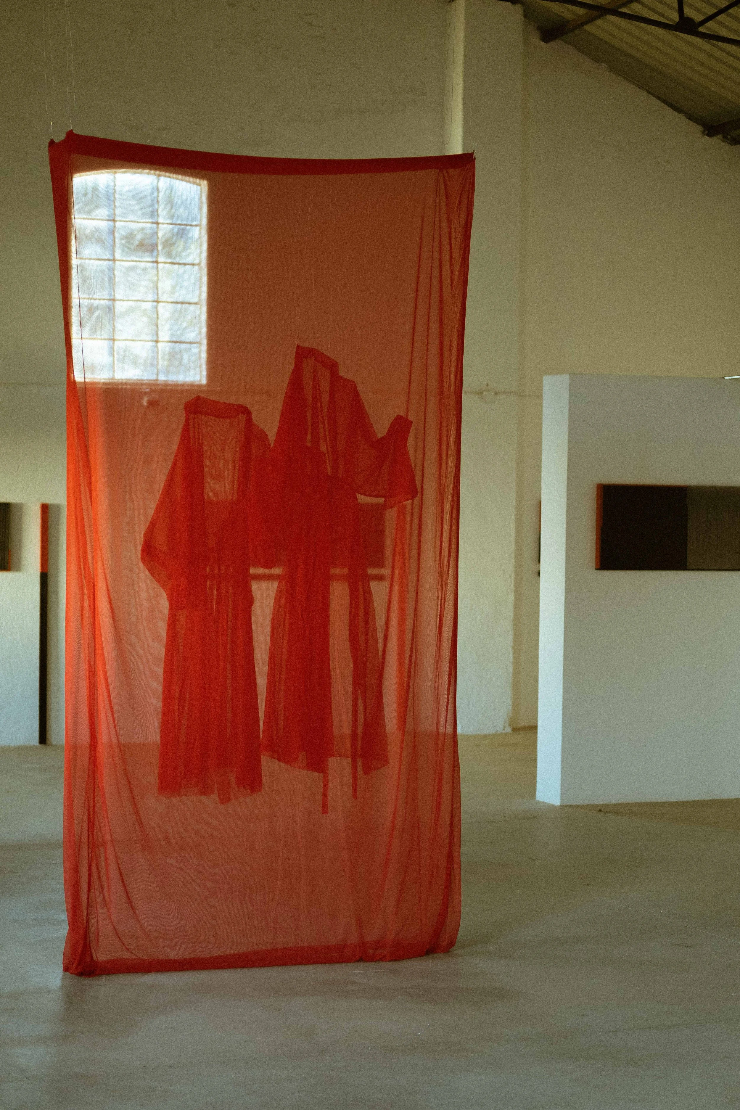 Os desenhos estão envoltos por uma membrana dupla semitransparente que convoca a possibilidade de serem observados dos dois lados. Este tecido é simultaneamente conjuntivo e disjuntivo, tanto nos cria continuamente novas possibilidades de ver subordinadas às diferentes lumínicas, como nos impede de ver as formas nas suras condições integrais.